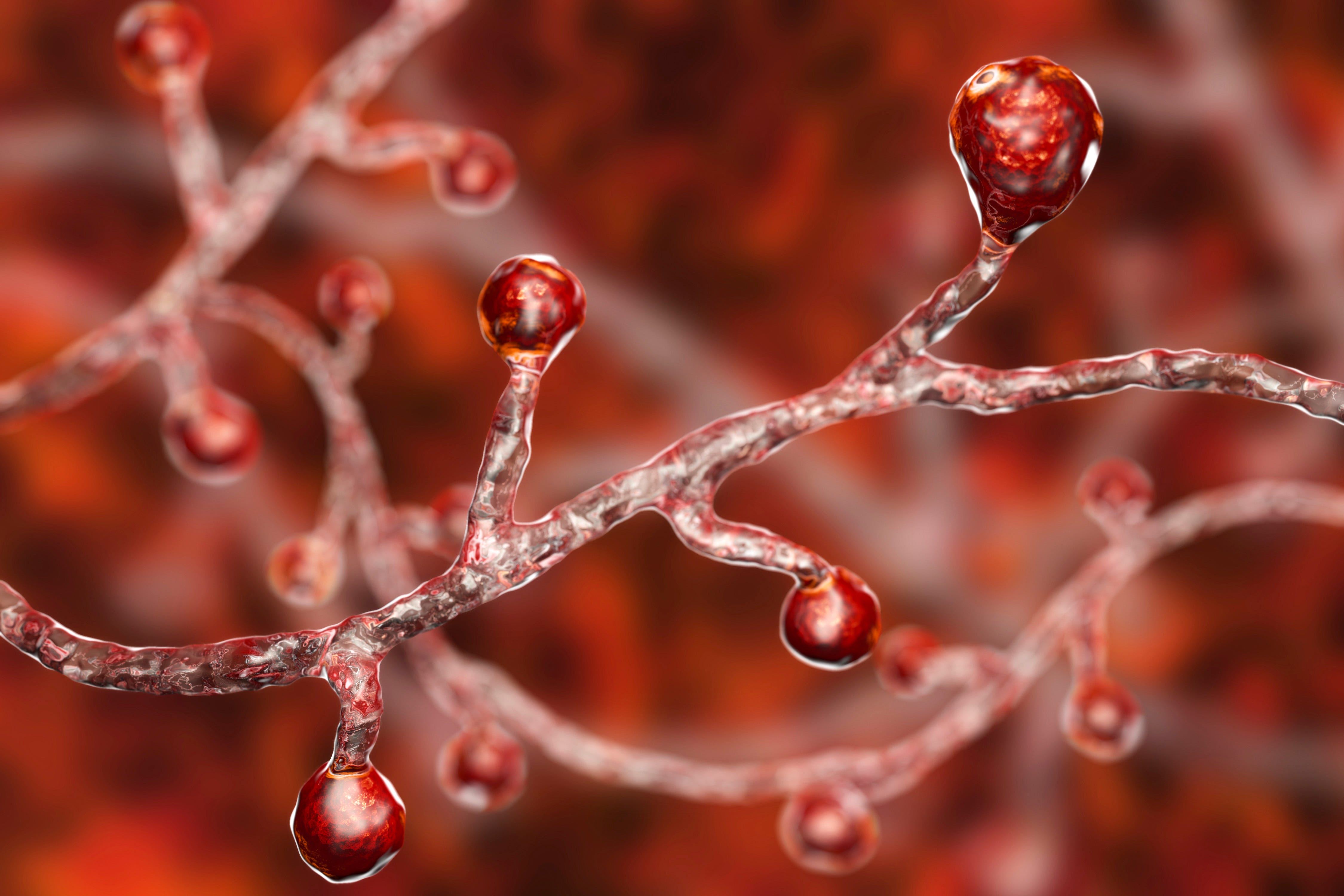 Blastomyces dermatitidis , colored image, showing the hyphae, or filaments, and globe-like structures forming spores for reproduction.